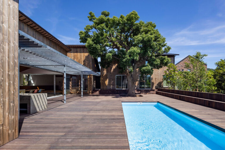 小山光+KEY OPERATIONによる、神奈川・葉山町の別荘「Hayama Huts」。住宅が建ち並ぶ地域に計画。隣地等への配慮と周辺からの視線を考慮し、プールを備えた中庭を5つの小屋が取り囲む“景色に馴染む集落”の様な建築を考案。断面寸法や勾配も既存住宅との良好な関係を意識して決定中庭 photo©小川重雄