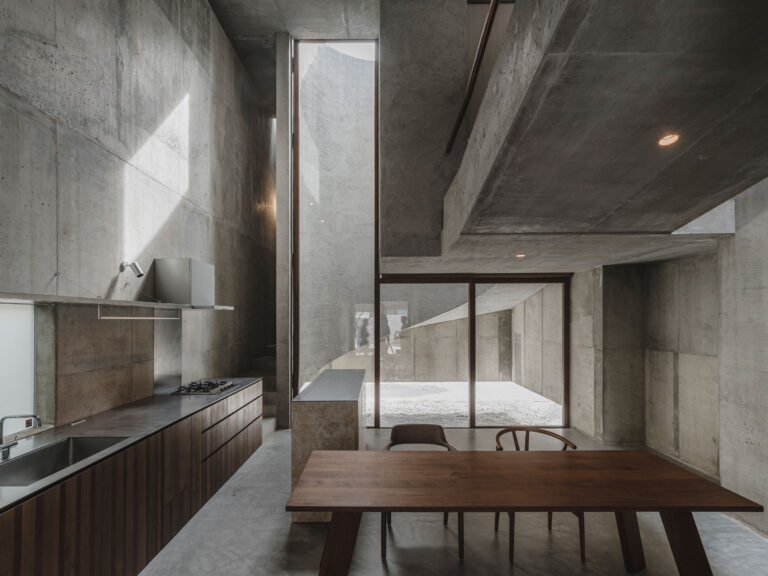 五十嵐敏恭 / STUDIO COCHI ARCHITECTSによる、沖縄・糸満市の「西崎の家」。住宅街の幹線道路と生活道路に挟まれた敷地。“街との距離感”と“快適な室内環境”を主題とし、道路と内部の間に其々の環境に対応する“緩衝帯”を備えた建築を考案。生活の多様な行為を受容し“立体的に風と光の通る住宅”を造る1階、居間からキッチン側を見る。 photo©Jingu Ooki