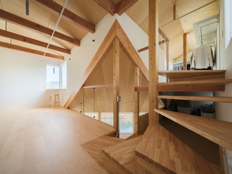 この計画では、それを空間の「形」によって実現しようと試みている。家の中心となる居間は直角二等辺三角の平面形を持ち、上に三角の片流れ屋根を載せる。平面的には山並みに向けて開かれ、断面的には山並みに向けて絞られる。一方、寝室や水回り、収納といった生活の諸室は二等辺に沿うL字型平面2階建のボリュームに納まり、居間はこのL字入隅に向かって断面的に開く。この空間の形によって、山並みや家族との濃淡ある関係性を築く様々な場所が生まれる。