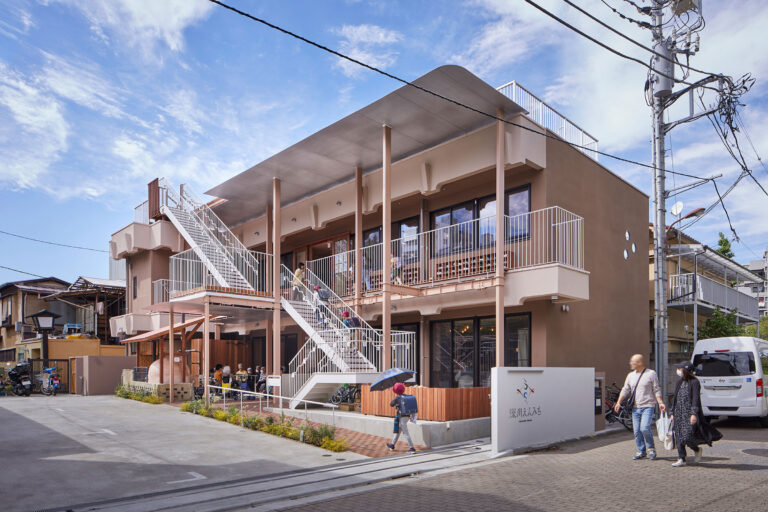 JAMZAによる、東京・江東区の「深川えんみち」。子供から高齢者までを受入れる“多世代共生の複合型福祉施設”。日常に福祉が存在する状況を目指し、地域の人々を招き入れる“道を引き込む動線計画”の建築を考案。街と繋がる為に“施設らしくない”境界面も作る外観、南東側より見る。 photo©Tomoyuki Kusunose