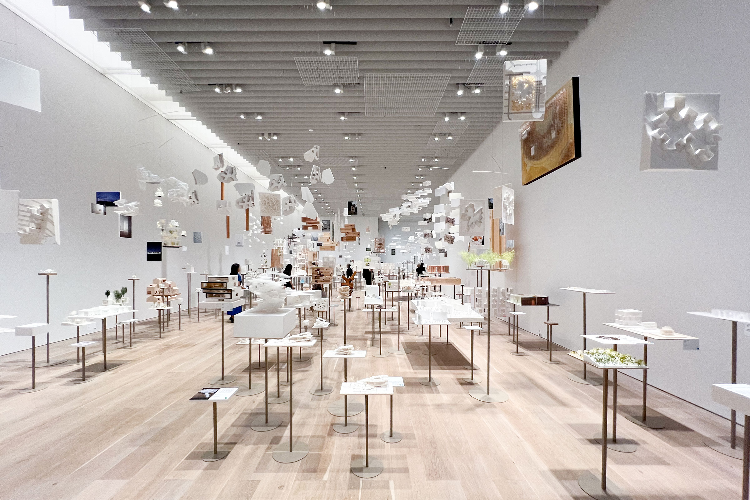 藤本壮介による、森美術館での展覧会の会場写真。活動初期から進行中の計画まで網羅的に紹介する大規模個展。模型・図面・写真に加え、インスタレーションや空間を体験できる大型模型なども公開