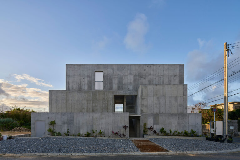 浦木拓也+浦木建築設計事務所による、三重の二世帯住宅「菰野の家」。敷地に余裕がある郊外で、生活に求められる接道境界面の構成要素を建物の形により解決することで、景観の在り方を考慮