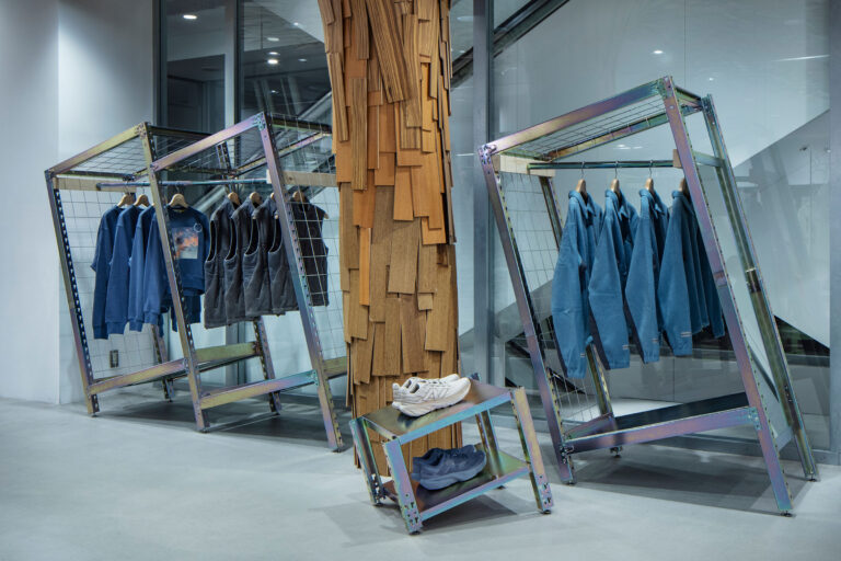 - 今津康夫 / ninkipen!による、愛知の店舗「guji名古屋」。出入口が手前に1つしかない600㎡超のL型の区画。奥まで“いかに引き込むか”を課題とし、空間の折れ点に“島状のレジスペース”を据えて中継点とする構成を考案。床材の角度をつけた配置でも人の流れを誘う