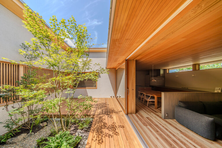 - 胡実建築設計事務所による、静岡・駿東郡の「東海道沿いの家」。交通量の多い道に面した敷地。中庭を中心に生活空間が展開する構成とし、床を部分的に下げる操作で“大地に身を埋めて寛げる”場も創出。外装の杉板は歴史が残る環境との連続性に加えて騒音への対応も意図