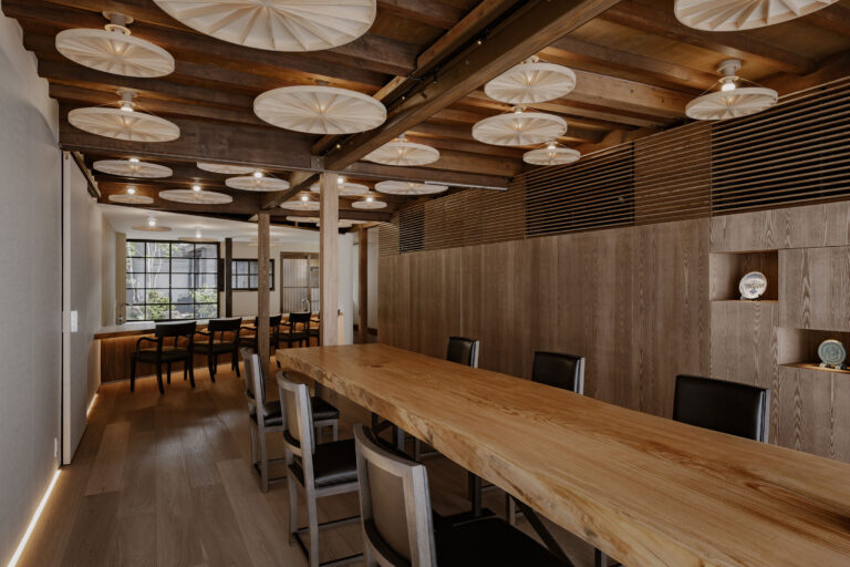 - 保坂猛による、東京・港区のオフィス「ECD 地球中心デザイン研究所」。環境配慮の徹底も意図した計画。企業コンセプト“地球中心”の体現を求め、“古代からの地図”を印刷した15台のテーブルを中心とする空間を考案。既存部材の数量調査を行って“ほぼ全ての再利用/再生”も実現