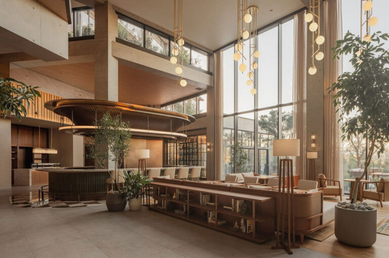 - ネリ&フーによる、中国・上海の飲食店「ザ・インプリント / ブルーボトルコーヒー コロンビア・サークル・カフェ」。既存建物を転用した活気ある複合施設内での計画。“暮らし”の本質を再考させる存在を目指し、“家庭らしさ”を暗示する空間を志向。家の“原型的な屋根”を“不在の形態”として表現した天井を考案