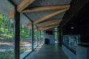 坂牛卓+中川宏文 / D.A.による、山梨の「富士山ジビエセンター」。野生鹿の処理加工と加工品の販売を行う施設。両者機能の共存を求め、処理加工機能を収めた切妻の量塊の周りにランドスケープと店舗に繋がる“裳階”を配する建築を考案。見学窓や展示などでジビエ文化の教育も担う「裳階」よりデッキテラスと店舗側を見る。 photo©渡辺竜康