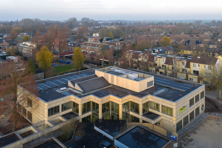 スタジオ・エー・クワドラートのジミー・ファン・デル・アー(Jimmy van der Aa)が、スクールズ・バイ・サークルウッド・コンソーシアムの一環としてOMAと協働して設計した、アムステルダムのバシススクール・ウィスパーウェイデがこのたび完成しました。フリソ・バウフグループによって建設された本校は、スタジオ・エー・クワドラートとOMAのデイヴィッド・ジャーノッテン(David Gianotten)およびミヒャエル・デン・オッター(Michael den Otter)との協働により開発されたサークルウッド・モジュラー木造システムを用いて建設された、オランダ初の学校です。この手法は、2050年までに「高品質で、柔軟性があり、持続可能な」学校を9校から30校整備することを目指す、アムステルダムの2023年イノベーション・パートナーシップ・スクール・ビルディング・プログラムのもとで採用されています。