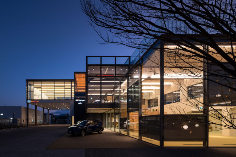 カーディーラーの建替計画です。建築家は、自動車を取巻く“環境の変化”に向き合い、用途の提案まで行って多目的ホール等を内包する“公共的な場”を志向しました。そして、様々な用途の入る“5つのBOX”がズレながら重なる構成の建築としました。店舗の場所はこちら(Google Map)。