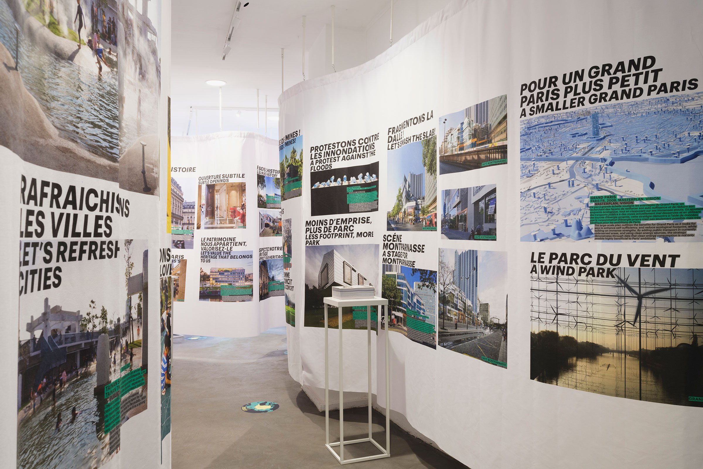 MVRDVとThe Why Factoryのパリでの建築展「アジール」の会場写真。“行動する”の名を冠した展覧会。“地球を改善する”の宣言を作品を通して伝える為に、小ぶりな空間に写真等が印刷された78mのカーテンを折り込む構成を考案。材料に再利用可能な物を使用し環境を考慮