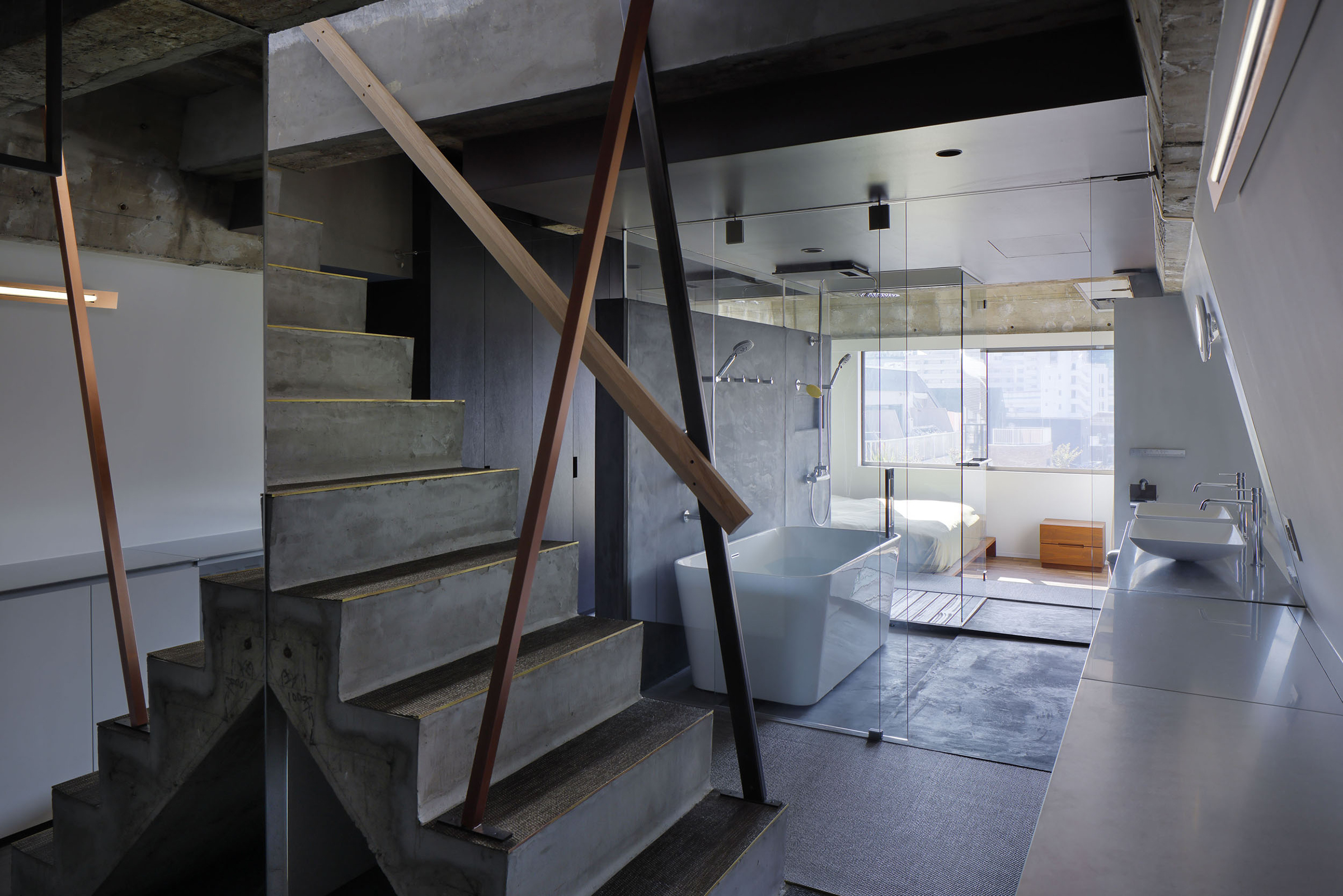 村上智也 / BENDSによる、大阪市の美容室「SAMAN」。場所性と施主の人柄を活かすため、内部を構成する素材の繋がりを意識して要素を組み合わせ、そこに木質の立方体を挿入したデザインを考案 SHAREarchitecture/feature