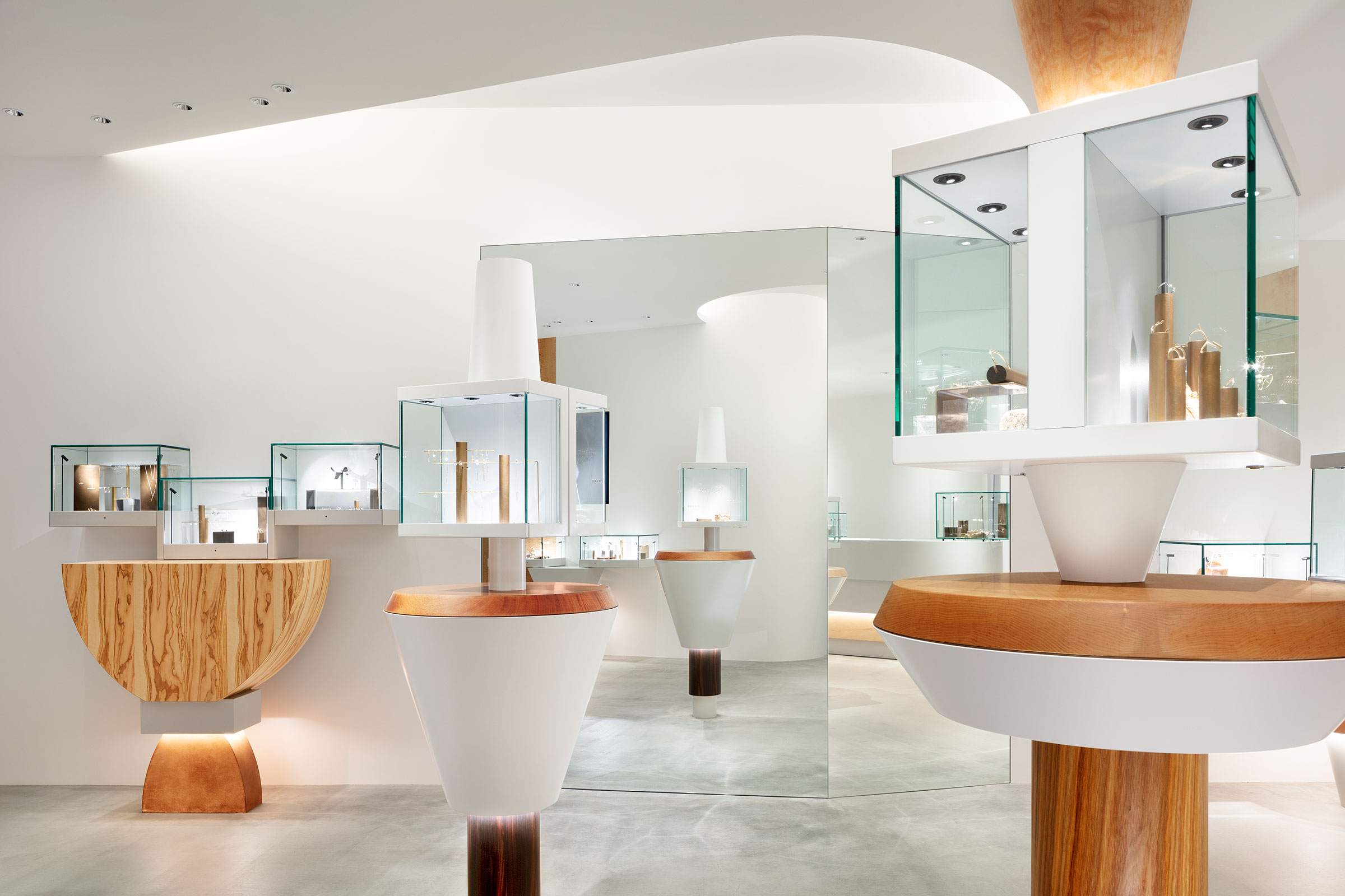 トラフによる、名古屋市の店舗「NUBIAN NAGOYA PARCO」。商業施設の内と外に入口がある区画に計画。環境条件の空間演出への援用を目指し、内では視界を絞り入店体験を設計して外では高低差を活かし気積の大きさで存在を周知。人と商品の多彩な出会い方をつくる SHAREarchitecture/fashion/feature