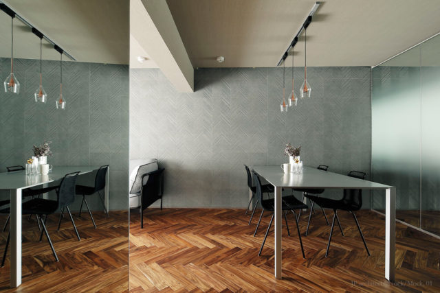 古代世界中を巡った定番のタイル柄に見られる対称形の幾何学パタンを4種類選び、それらをランダムにレイアウトしている。ところによっては造作家具の割り付け上、プロポーションの歪んでいる箇所があるが、機械制御の持つ極端な精巧さと実直さ、抽象性を強調するべく淡々と比率の歪んだ模様を反復させた。