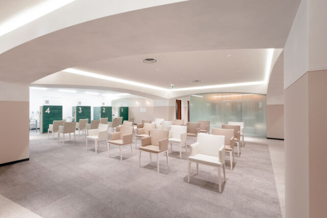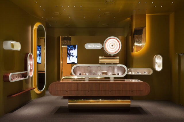 ファブリック、壁紙、塗装、椅子も極力同色・同トーンに揃えることで、巨大なMDFの量塊から削り出された彫刻空間として感じられるようにしている。各種素材の持つ硬さ、温度感、湿度感、重量感といった経験的なマテリアリティが混同する、新鮮な体性感覚にあふれる空間を創出した。